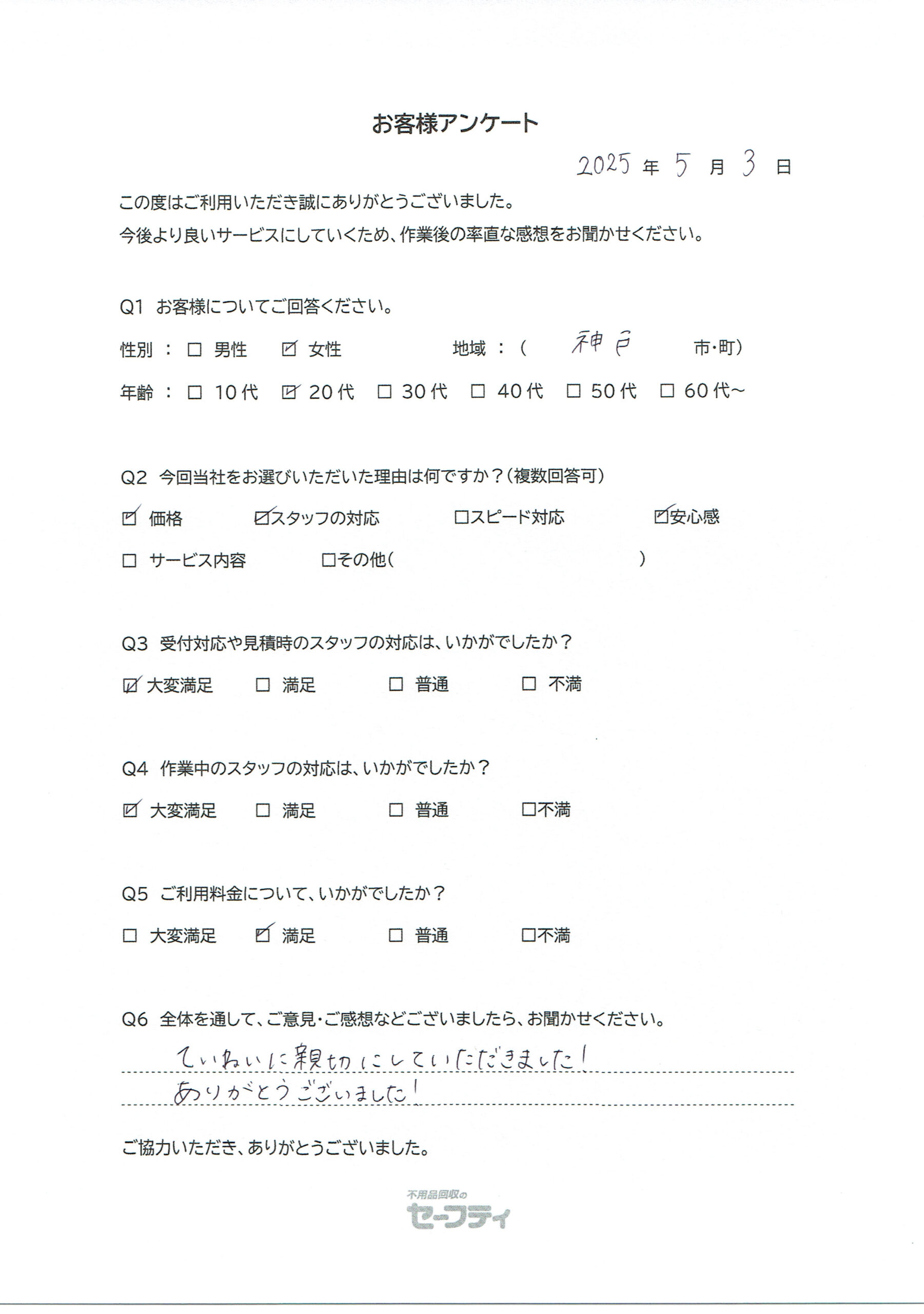 神戸市Iさま(不用品回収ご利用のお客様アンケート)