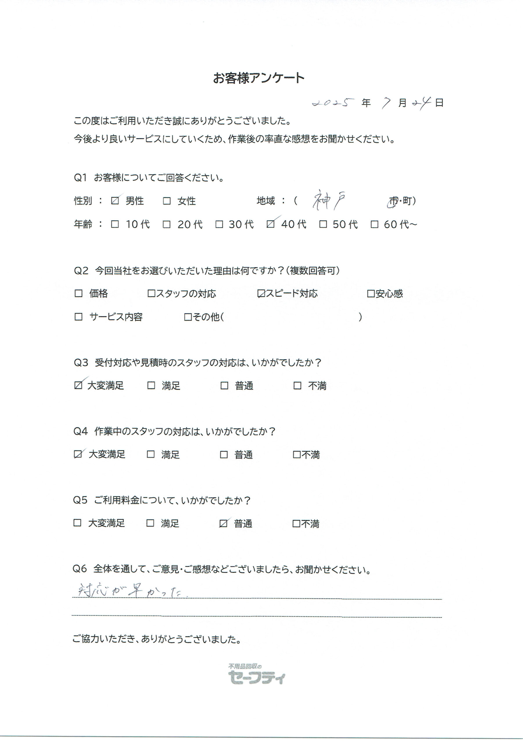 神戸市Hさま(不用品回収ご利用のお客様アンケート)